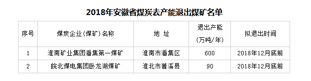 2018年安徽省煤炭去產能退出煤礦名單公示