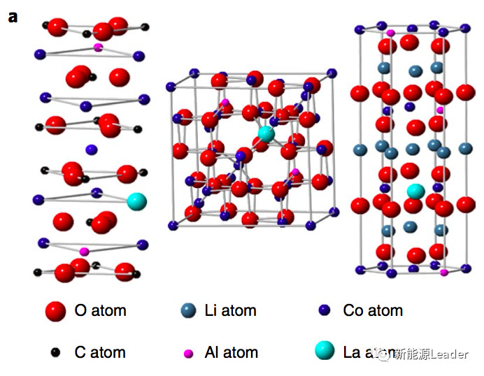鈷酸鋰材料的理論容量為274mAh/g,但在實(shí)際使用中為了保持鈷酸鋰的結(jié)構(gòu)穩(wěn)定性和良好的循環(huán)性能,我們一般將充電電壓限制在4.2V左右,因此鈷酸鋰的實(shí)際使用容量也就在140mAh/g左右,近年來(lái)材料廠家通過(guò)表面包覆合、元素?fù)诫s等手段提升了鈷酸鋰材料的結(jié)構(gòu)穩(wěn)定性,充電電壓可以提升至4.35V,從而使得鈷酸鋰材料的可逆容量達(dá)到165mAh/g左右,但是這仍然無(wú)法滿足高比能鋰離子電池的需求,為此華為中央研究院聯(lián)合美國(guó)阿貢國(guó)家實(shí)驗(yàn)室通過(guò)La和Al摻雜,將LiCoO2的穩(wěn)定電壓提高到了4.5V,可逆容量達(dá)到190mAh/g,其中La能夠增加LCO材料在c軸方向上的晶胞參數(shù),Al則能夠起到促進(jìn)Li+擴(kuò)散、穩(wěn)定晶體結(jié)構(gòu)和防止LCO材料相變的作用,兩者相互作用顯著改善了LCO材料在高電壓下的結(jié)構(gòu)穩(wěn)定性,循環(huán)50次后仍然能夠保持96%的容量,并使得LCO材料的倍率性能得到了大幅提高。