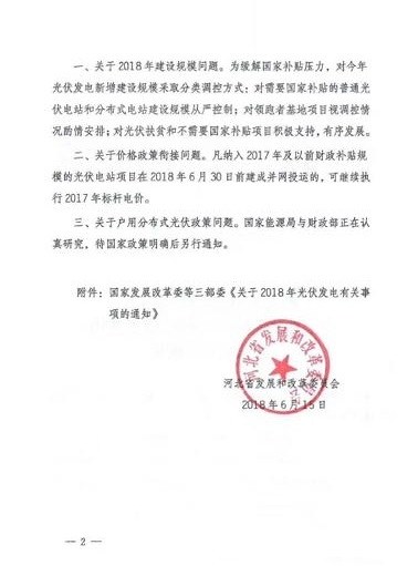 近日,河北省發改委發布了關于貫徹落實國家2018年光伏發電有關要求的通知,該通知指出,為緩解國家補貼壓力,對今年光伏發電新增建設規模采取分類調控方式:對需要國家補貼的普通光伏電站喝分布式電站建設規模從嚴控制;對領跑者基地項目視調控情況酌情安排;對光伏扶貧喝不需要國家補貼項目積極支持,有序發展。