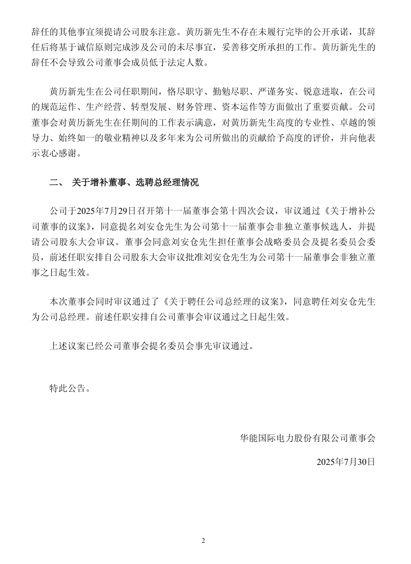 7月30日,華能國際發布公告稱,公司董事、總經理黃歷新先生因工作調整,于近日依據有關規定向公司董事會提交了書面辭職報告,申請辭去公司董事、總經理以及董事會戰略委員會和提名委員會委員職務。