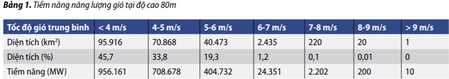 工業和貿易部(MoIT)在世界銀行的支持下,在三個地點進行了風力取樣,為越南風能潛力的重新定義做出了貢獻。該研究的結果以及其他數據已被MoIT用于更新越南的風圖。下表列出了80米高度的風電潛力評估結果。