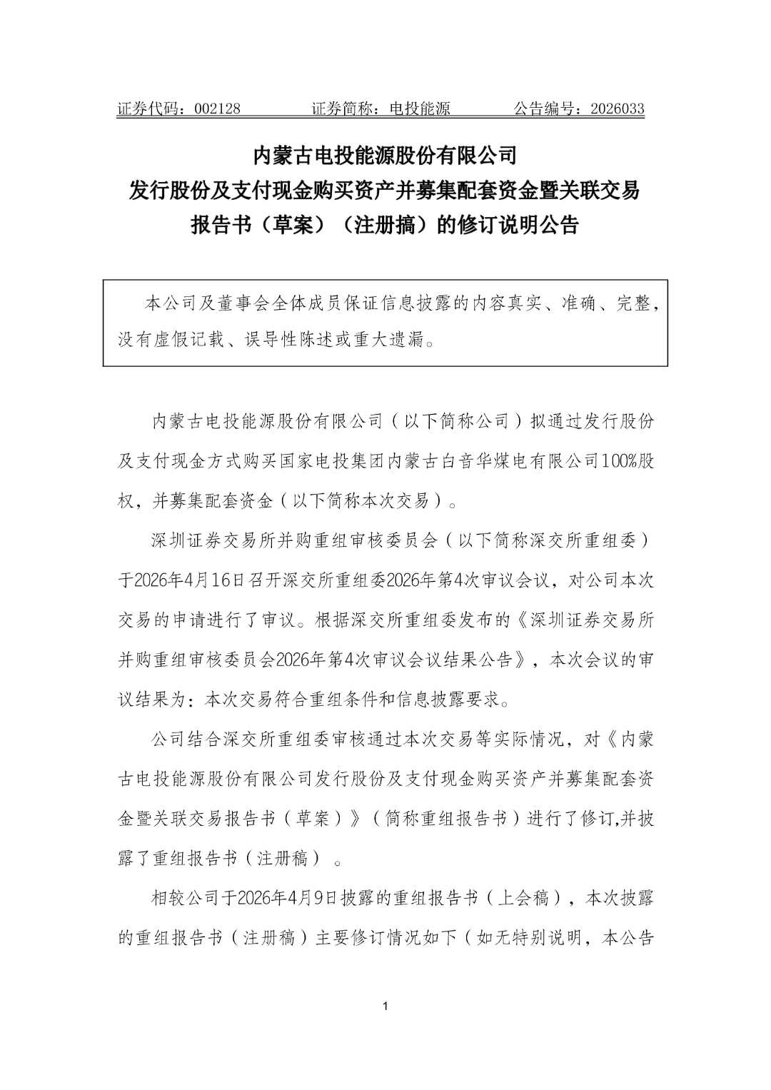 4月16日,內(nèi)蒙古電投能源股份有限公司(以下簡(jiǎn)稱電投能源)公告稱,擬通過發(fā)行股份及支付現(xiàn)金方式購(gòu)買國(guó)家電投集團(tuán)內(nèi)蒙古白音華煤電有限公司100%股權(quán),并募集配套資金。深圳證券交易所并購(gòu)重組審核委員會(huì)(以下簡(jiǎn)稱深交所重組委)于4月16日召開深交所重組委2026年第4次審議會(huì)議,對(duì)本次交易的申請(qǐng)進(jìn)行了審議。根據(jù)深交所重組委發(fā)布的《深圳證券交易所并購(gòu)重組審核委員會(huì)2026年第4次審議會(huì)議結(jié)果公告》,本次會(huì)議的審議結(jié)果為: 本次交易符合重組條...