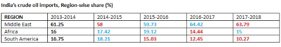 印度過去五年的區(qū)域原油進口數(shù)據(jù)顯示,中東國家的市場份額增加,而非洲和南美洲的份額在此期間有所下降。2017 - 2018年中東國家的比例從2013-2014財政年度的61%增加到64%。上個財政年度非洲國家的市場份額略微下降至15%,而2013 - 2014年為16%。