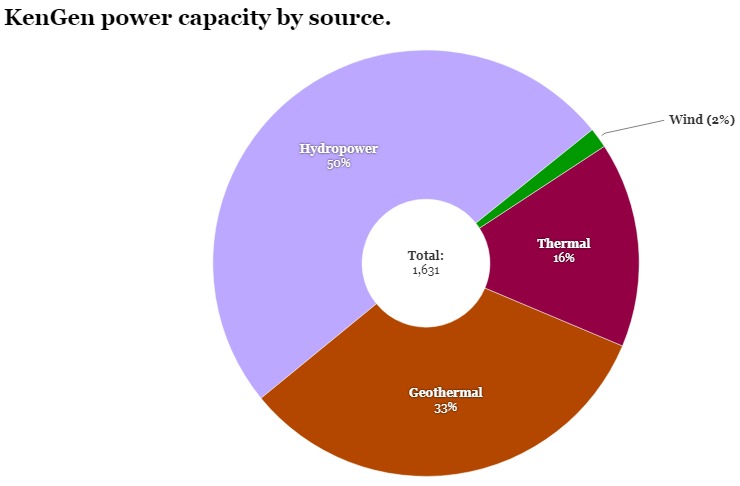 目前,KenGen的總發電量為1,631兆瓦,其中一半是水力發電(818兆瓦),地熱(534兆瓦),其次是熱能(254兆瓦)和風力(25兆瓦)。