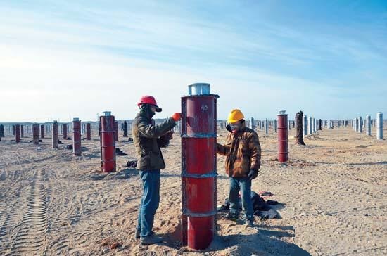 玉門鑫能鄭家沙窩5萬千瓦熔鹽塔式光熱發電項目建設現場。該項目總投資17.9億元,占地2.47平方公里,計劃建設總裝機容量5萬千瓦的熔鹽塔式光熱電站,建成后,年發電量可達2.02億千瓦時。