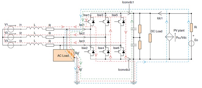 在交直流混合電網(wǎng)中直流負(fù)載側(cè),顯然普通AC型剩余電流保護(hù)器無(wú)法完成保護(hù),需要使用DC-RCD進(jìn)行直流漏電保護(hù),然而目前直流漏電保護(hù)還并未推廣和市場(chǎng)化,國(guó)內(nèi)也尚無(wú)相關(guān)標(biāo)準(zhǔn)。實(shí)際上,在交直流混合微電網(wǎng)中,漏電成分是非常復(fù)雜的,我們來(lái)看下ABB對(duì)于交直流混合微電網(wǎng)中交流側(cè)接地故障的仿真模型。