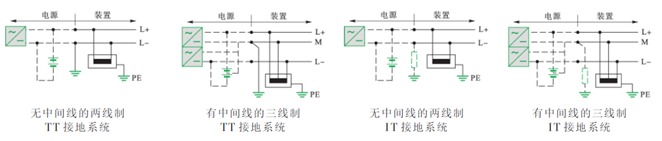 與交流配電系統(tǒng)一樣,直流配電系統(tǒng)的接地形式也分為T(mén)N、TT、IT,由于直流用電設(shè)備對(duì)供電電源要求有可能是負(fù)電源或正電源,因此配電系統(tǒng)中有兩條電源線的兩線制或增加一條中間導(dǎo)線(M線)的三線配電制。下圖3為配電系統(tǒng)常用的TT、IT接地形式的系統(tǒng)簡(jiǎn)圖。