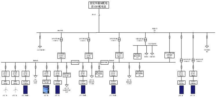 隨著分布式發(fā)電和儲(chǔ)能的大量應(yīng)用和直流負(fù)荷的快速增長(zhǎng),使得直流配電越來(lái)越受關(guān)注。直流配電系統(tǒng)將會(huì)成為未來(lái)配電技術(shù)的一個(gè)重要組成部分。2017年8月26日,國(guó)家863課題“高密度分布式能源接入直流混合微電網(wǎng)關(guān)鍵技術(shù)”示范工程在浙江上虞投入運(yùn)行,實(shí)現(xiàn)國(guó)內(nèi)首次交直流混合微電網(wǎng)用戶側(cè)運(yùn)行,工程改造或接入分布式光伏總?cè)萘?.4MW,2套5kW風(fēng)力發(fā)電系統(tǒng),1套250kW/800kWh鉛酸電池儲(chǔ)能系統(tǒng),1套交直流微電網(wǎng)功率變換與網(wǎng)架系統(tǒng),系統(tǒng)內(nèi)交流最高負(fù)荷約1.2MW,直流最高負(fù)荷約0.9MW。下圖為該工程拓?fù)鋱D。