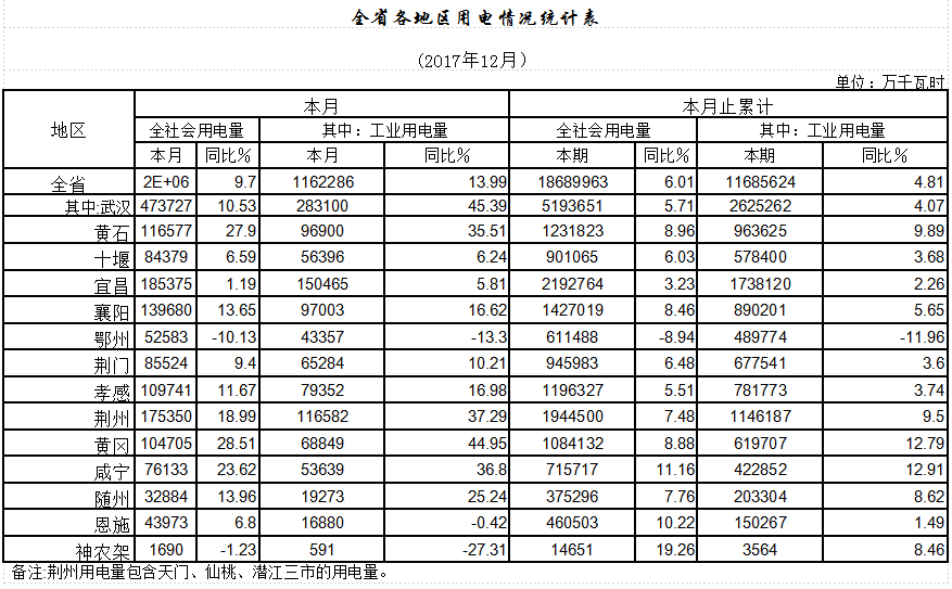 全省14個用電統(tǒng)計地區(qū)中,武漢等13個地區(qū)全社會用電同比增長,其中咸寧、恩施、神農(nóng)架林區(qū)3地全社會用電增幅在兩位數(shù)以上。各地工業(yè)用電基本與全社會用電同步增長,僅鄂州市受鋼鐵行業(yè)淘汰落后產(chǎn)能影響工業(yè)用電下降。“一主兩副”城市武漢、宜昌、襄陽3市全社會用電量占到全省的47.16%,工業(yè)用電量占全省的44.63%,3市全社會和工業(yè)用電均增幅穩(wěn)健,有力促進(jìn)了全省用電的增長。