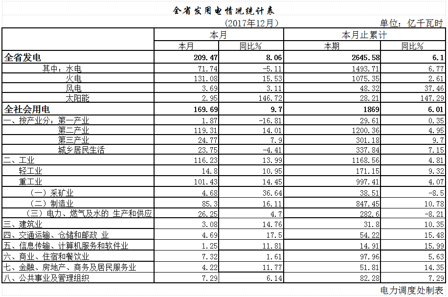 2017年,全省用電需求持續(xù)穩(wěn)定增長,各大產(chǎn)業(yè)和城鄉(xiāng)居民生活用電全面增長。全省電力戰(zhàn)線認(rèn)真貫徹落實五大發(fā)展理念,以確保全省電力供應(yīng)為中心,以降成本、惠民生為重點,團結(jié)協(xié)作,克難奮進(jìn),確保了全省電網(wǎng)安全穩(wěn)定運行和電力正常供應(yīng),為全省經(jīng)濟社會發(fā)展提供了堅強的電力支撐。截止年底,全省全口徑裝機容量7124.48萬千瓦,同比增長5.62%;全年發(fā)電量2645.58億千瓦時,增長6.10%;全社會用電量1869.00億千瓦時,增長6.01%,其中工業(yè)用電量1168.59億千瓦時,增長4.81%。