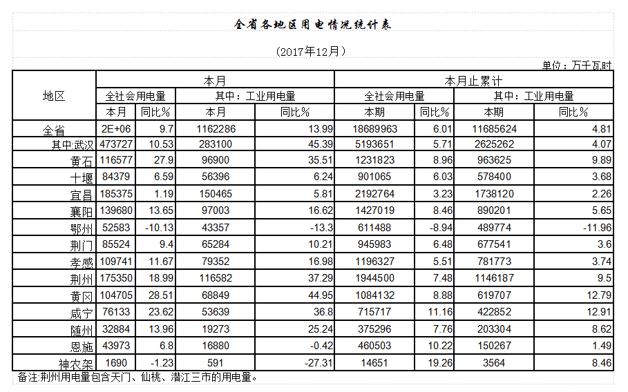(五)全省各地區用電普遍增長,“一主兩副”城市增速穩健。全省14個用電統計地區中,武漢等13個地區全社會用電同比增長,其中咸寧、恩施、神農架林區3地全社會用電增幅在兩位數以上。各地工業用電基本與全社會用電同步增長,僅鄂州市受鋼鐵行業淘汰落后產能影響工業用電下降。“一主兩副”城市武漢、宜昌、襄陽3市全社會用電量占到全省的47.16%,工業用電量占全省的44.63%,3市全社會和工業用電均增幅穩健,有力促進了全省用電的增長。