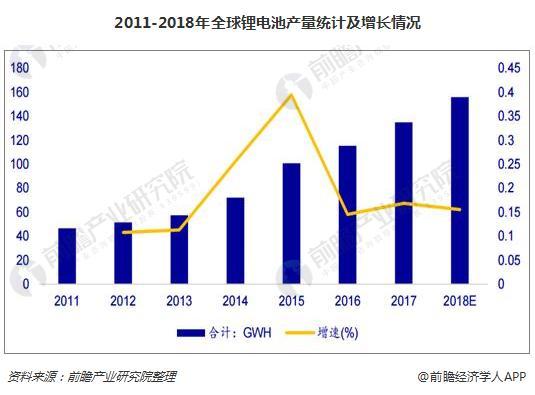 2011年以來,由于能源技術變革以及新興科技的帶動下,全球鋰離子電池產量進入飛速增長期,2012年到2015年增速均超過50%。2015年全球鋰電池產量100.75GWh,同比增長39.45%;2017年,鋰離子電池主要應用市場增速放緩,增速只有16.85%,但受益于新能源汽車行業景氣帶動的動力電池繁榮,預計2018年全球鋰電池增速維穩,產量有望達到155.82GWH,市場規模將到達2313.26億元。