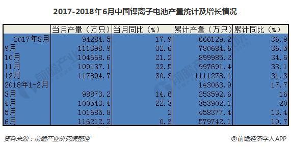 據前瞻產業研究院發布的《鋰電池行業市場需求預測與投資戰略規劃分析報告》統計數據顯示,2018年6月,中國鋰離子電池產量為116212.2萬只,同比微增0.3%。2018年1-6月,全國鋰離子電池累計產量達579742.1萬只,同比增長10.7%。