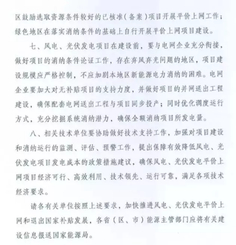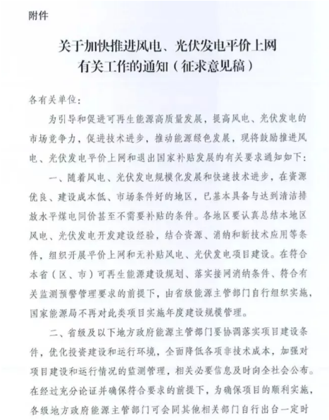 據(jù)獲悉,近日,國家能源局印發(fā)了《關(guān)于加快推進(jìn)風(fēng)電、光伏發(fā)電平價(jià)上網(wǎng)有關(guān)工作的通知(征求意見稿)》,通知指出,隨著風(fēng)電、光伏發(fā)電規(guī)模化發(fā)展和快速技術(shù)進(jìn)步,在資源優(yōu)良、建設(shè)成本低、市場(chǎng)條件好的地區(qū),已基本具備與達(dá)到清潔排放水平煤電同價(jià)甚至不需要補(bǔ)貼的條件。