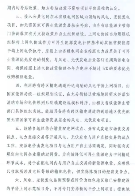 此外,風(fēng)電、光伏發(fā)電監(jiān)測(cè)預(yù)警或評(píng)價(jià)為紅色地區(qū)除已安排建設(shè)的平價(jià)上網(wǎng)示范項(xiàng)目外,不再專門安排新的平價(jià)上網(wǎng)項(xiàng)目;橙色地區(qū)鼓勵(lì)選取資源條件較好的已核準(zhǔn)(備案)項(xiàng)目開展平價(jià)上網(wǎng)工作;綠色地區(qū)在落實(shí)消納條件的基礎(chǔ)上自行開展平價(jià)上網(wǎng)項(xiàng)目建設(shè)。