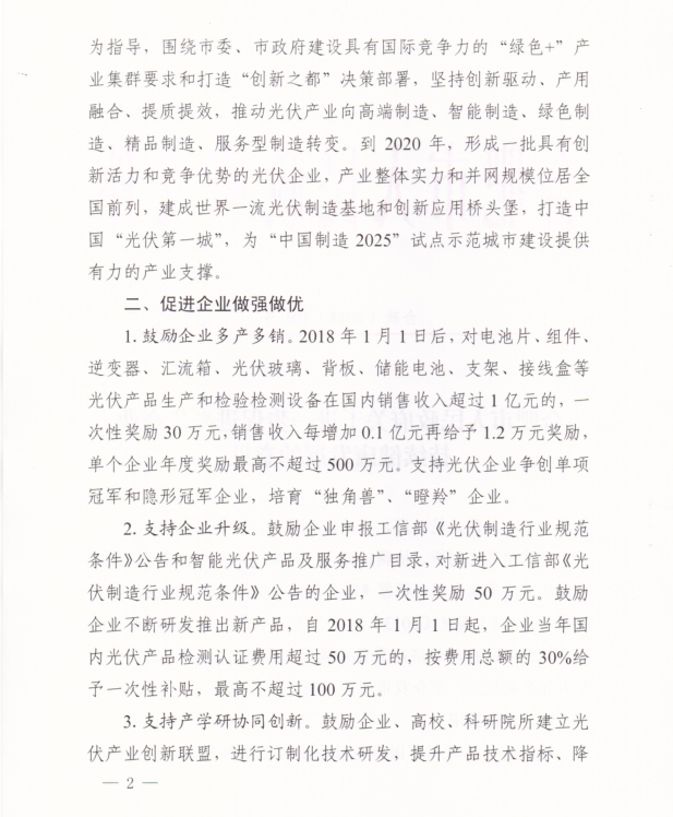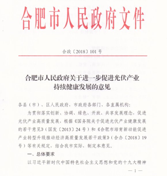 近日,合肥市人民政府關于進一步促進光伏產業持續健康發展的意見指出,對符合光伏發電利用要求,屋頂面積達1000平方米以上的新建建筑,在規劃、設計中應設置光伏發電系統。促進特色行業應用,開展智能光伏在工業園區應用、建筑及城鎮應用、交通應用、農業應用、電站應用、扶貧應用等示范,推動綠色發展。對本政策發布后至2018年12月31日前建成并網,且符合國家和行業標準及政策要求的分布式光伏項目,自并網次月起給予投資人1.15元/千瓦時補貼,連續補貼5年,其中,并網規模超過0.1兆瓦時的屋頂光伏項目,按裝機容量給予屋頂產權人3萬元/兆瓦的一次性獎勵。
