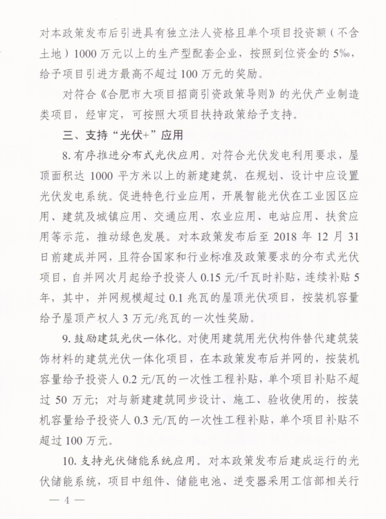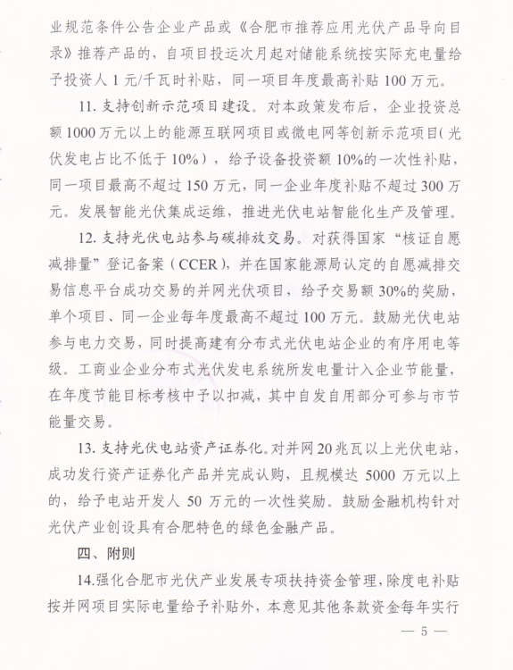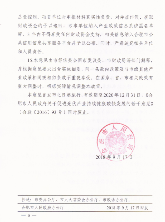 合肥地方光伏補貼:分布式0.15元/kWh 連補5年
