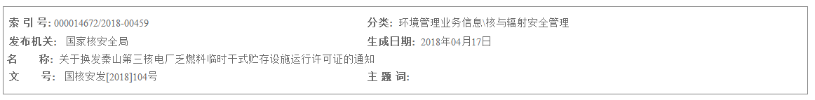 關(guān)于換發(fā)秦山第三核電廠乏燃料臨時(shí)干式貯存設(shè)施運(yùn)行許可證的通知