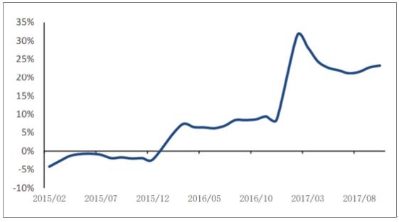 供給體系的質量和效率不斷提升,各類商品價格穩步上揚。2017年6月以來,動力煤價漲幅約10%,而鋼鐵、銅鋁等金屬價格漲幅在20%-30%之間,國內標志性的南華商品指數漲幅超20%。同時,工業企業的成本費用降低,盈利能力增強。1-9月份,規模以上工業企業每百元主營業務收入中的成本費用為92.9元,同比降低0.5元;營業務收入利潤率為6.17%,同比提高0.51個百分點,企業的盈利情況顯著改善。