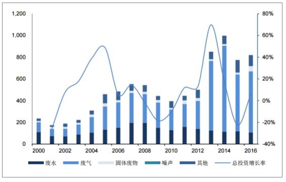 工業環保整體投資增速回升。全國工業污染治理完成投資總額在經歷2013年的增速高峰后,于2014和2015年連續兩年下降,2015年呈現-22%的負增長。到2016年整體投資額為819億元,增速回升至+6%,2017年的情況現在看來保持了較快的增長勢頭。各項污染物治理中,廢氣治理投資占比較大,2016年整體投資額達到561億元,同比+8%。