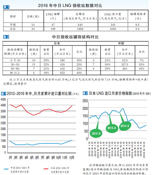1972年投產的Senbokul是日本首個液化天然氣(LNG)接收站,至今已有45年。截至2016年末,日本共建成投運34個LNG接收站。而我國自2006年首個LNG接收站在深圳大鵬投產,到2016年底,相繼有14個LNG接收站建成投產。從接收站的數量、總罐容等一系列指標分析,2016年,中日兩國LNG接收站周轉次數接近(見表1),似乎效率相當。但仔細分析兩國接收站罐容結構的差別,不難看出,我國70%的接收站總罐容都小于50萬立方米,而日本39%的接收站總罐容大于50萬立方米,占全部接收站總罐容的67%,其中大于80萬立方米的接收站有6個,罐容占比達44%,可見日本接收站普遍罐容較大。(見表2)