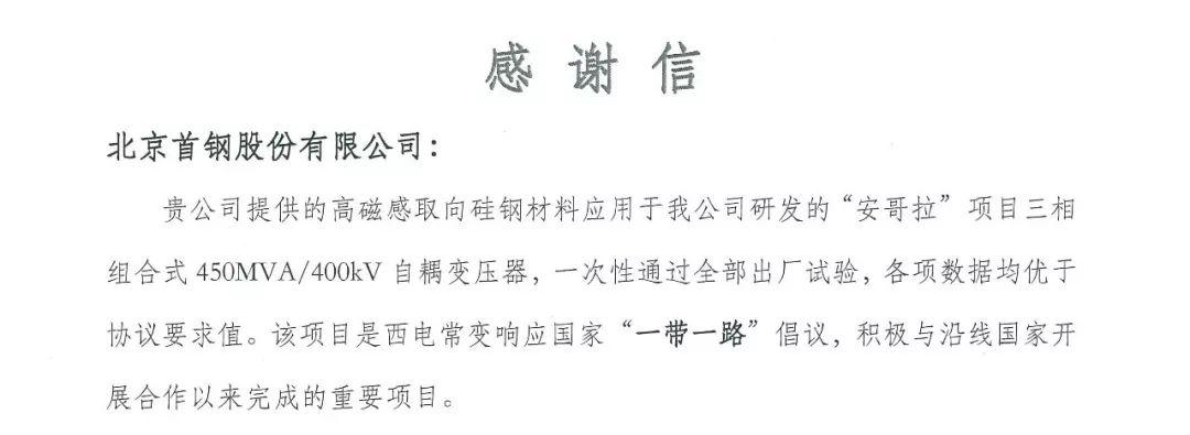 近日,首鋼股份(000959)收到來(lái)自常州西電變壓器有限責(zé)任公司(簡(jiǎn)稱“西電常變”)的感謝信,信中稱:該公司為“安哥拉LACA-HUAMBO連接線”項(xiàng)目研制的三相組合式450MVA/400kV自耦變壓器,其中4臺(tái)采用了首鋼取向硅鋼,全部一次通過(guò)出廠試驗(yàn),各項(xiàng)數(shù)據(jù)優(yōu)于協(xié)議要求值。