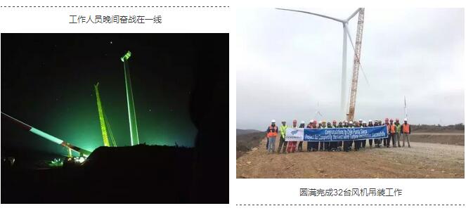 在集團公司指導(dǎo)下,海外公司與太平洋水電團隊精心組織管理,與項目管理團隊及風機供貨和安裝承包商金風科技克服了各種難題,工作人員合理調(diào)整工作時間和進行風情預(yù)測,加班加點搶占合理風速時間,最終在各方的共同努力下,安全、高質(zhì)量的實現(xiàn)全部32臺風機吊裝任務(wù)。