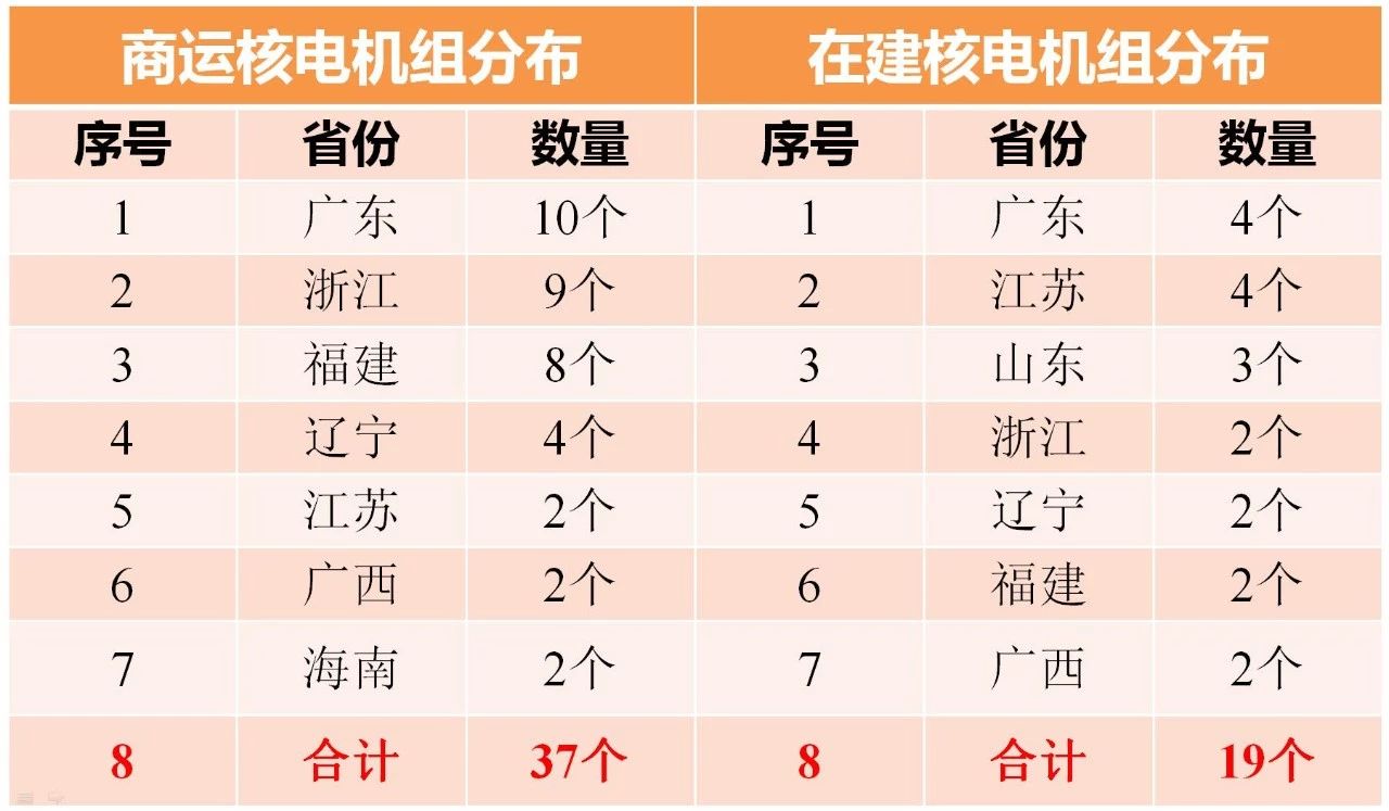 我國核電機組主要分布于東南沿海。截至2017年12月31日,我國商運核電機組分布在7個省,廣東省、浙江省與福建省數(shù)量最多,商運核電機組最多的市為浙江省嘉興市,機組數(shù)量為9臺;我國在建核電機組分布在7個省,廣東省、江蘇省與山東省數(shù)量最多。截至2017年12月我國核電廠分布情況如表1所示。