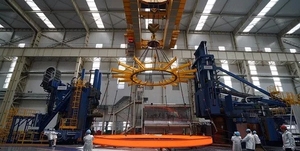 2018年5月30日上午10點(diǎn)18分,山東伊萊特重工股份有限公司(以下簡(jiǎn)稱伊萊特)在濟(jì)南章丘隆重舉行“大鍛件項(xiàng)目暨全球首臺(tái)超級(jí)軋環(huán)機(jī)投產(chǎn)儀式”,這次下線的全球最大軋環(huán),直徑16米,重126噸,打破了原世界最大鍛環(huán)直徑10米的紀(jì)錄,將我國(guó)環(huán)類、筒類鍛件的制造能力一舉提高到世界領(lǐng)先水平。